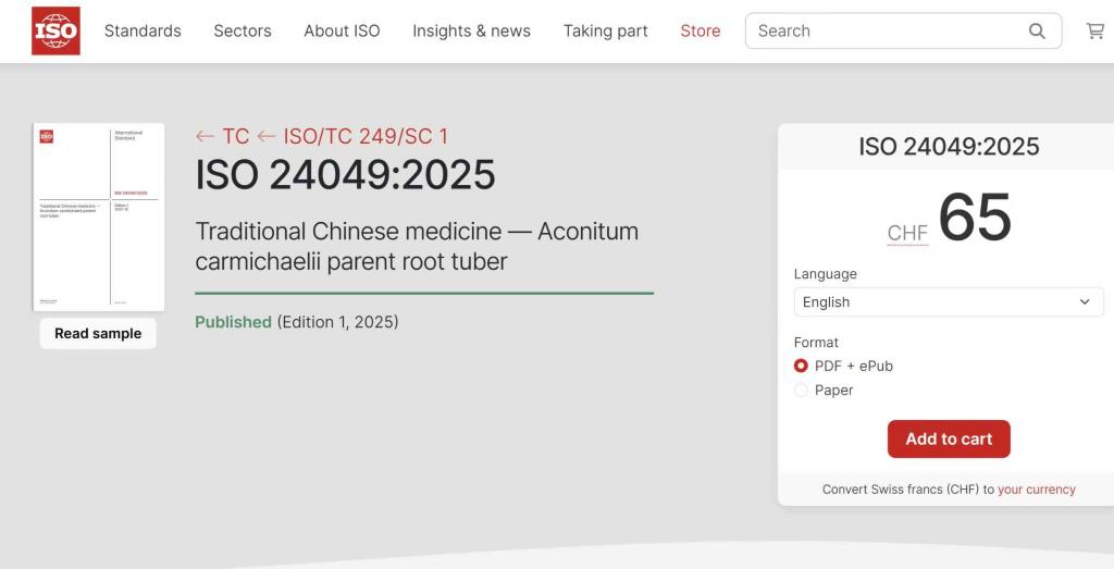 近日,由广东省中医院刘良院士团队黄虞枫副研究员与德国汉堡-埃彭多夫大学Thomas Friedemann博士联合牵头制定的《中医药—川乌》ISO 24049:2025国际标准正式发布实施。该标准于10月21日由国际标准化组织(ISO)面向全球公布,标志着中药川乌的质量控制与国际化应用迈出关键一步。值得一提的是,此项标准较原定计划提前10个月完成研制并发布,展现了项目团队的高效协作与技术创新实力。