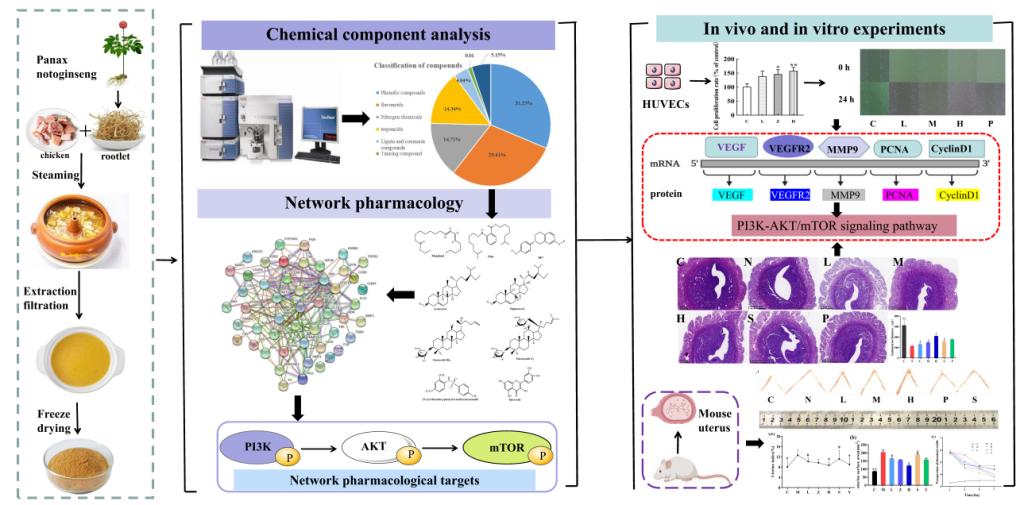为了解释产妇为何偏爱三七汽锅鸡,团队进一步开展了三七汽锅鸡促进产后小鼠子宫复旧的药理机制研究。团队发现三七汽锅鸡可显著促进产后小鼠子宫内膜增生、恢复子宫指数,升高血清中催乳素(PRL)和孕酮(P)等激素水平,降低内皮素-1(ET-1)含量,抑制炎症因子TNF-α和IL-1β的表达,从而共同促进子宫修复和血管生成。此外,三七汽锅鸡通过激活PI3K/AKT/mTOR信号通路,上调血管内皮生长因子(VEGF)及其受体VEGFR2的表达,促进人脐静脉血管内皮细胞(HUVEC)的增殖与迁移。