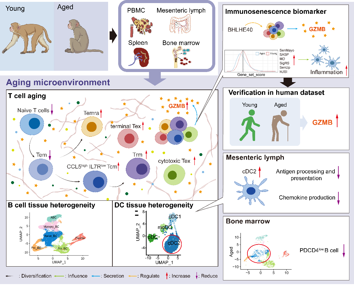 衰老导致免疫系统功能衰退,解析其机制、鉴定衰老标志物并开发干预策略是老龄化研究的核心挑战。受限于人体样本获取难度及伦理约束,人类免疫衰老研究面临瓶颈。灵长类动物因免疫系统与人类高度保守且衰老表型相似,成为揭示免疫衰老细胞异质性、鉴定关键标志物的理想模型。系统性解析其免疫器官衰老变化,不仅能够填补灵长类免疫衰老研究的空白,更为人类抗衰老策略提供了理论依据。