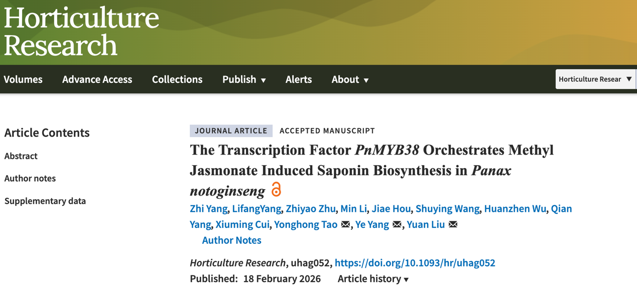 2026年2月,国际知名期刊 Horticulture Research 在线发表了昆明理工大学三七资源可持续发展利用重点实验室刘源副教授、杨野教授、崔秀明研究员团队与文山州农业科学院陶永宏研究员合作完成的题为 The Transcription Factor PnMYB38 Orchestrates Methyl Jasmonate Induced Saponin Biosynthesis in Panax notoginseng 的研究论文。该研究首次通过全基因组鉴定、多组学联合分析与功能验证,系统揭示了三七 MYB 转录因子家族的特征,并证实 PnMYB38 作为核心调控因子,介导 MeJA 信号调控三七皂苷生物合成的分子机制,成功构建了“MeJA-PnMYB38-皂苷合成”的转录调控网络模型,为三七精准育种提供了全新的理论依据与分子靶点。