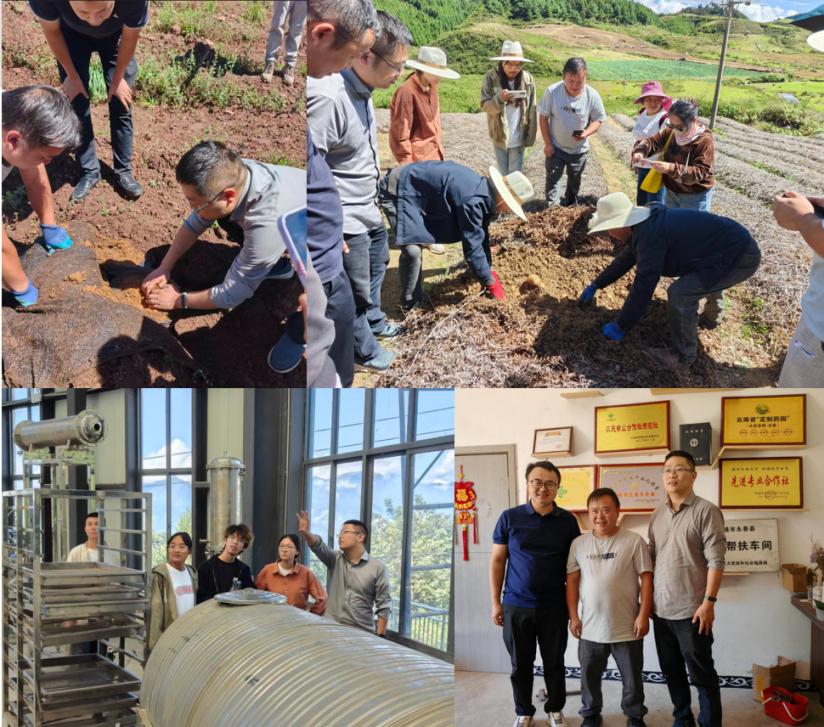 在古德生物团队的陪同下,生科院一行人前往永善县莲峰镇天麻种植基地与天麻产地加工工厂,开展“从田间到车间”的全链条实地调研。在种植基地,双方聚焦天麻种植过程中的关键技术难题展开深入探讨,针对天麻两菌培育、高效种植技术推广、生长环境精准调控等实际问题,生科院老师结合专业知识提出指导性建议;在产地加工工厂,团队详细了解天麻清洗、切片、烘干等初加工环节的流程与标准,围绕加工过程中如何提升天麻有效成分保留率、优化生产效率等问题交换意见。期间,向诚副院长与马佶老师与在岗实习学生现场交流,针对实习中遇到的技术困惑现场答疑,鼓励学生将理论知识与实践操作深度融合,积累产业一线经验。